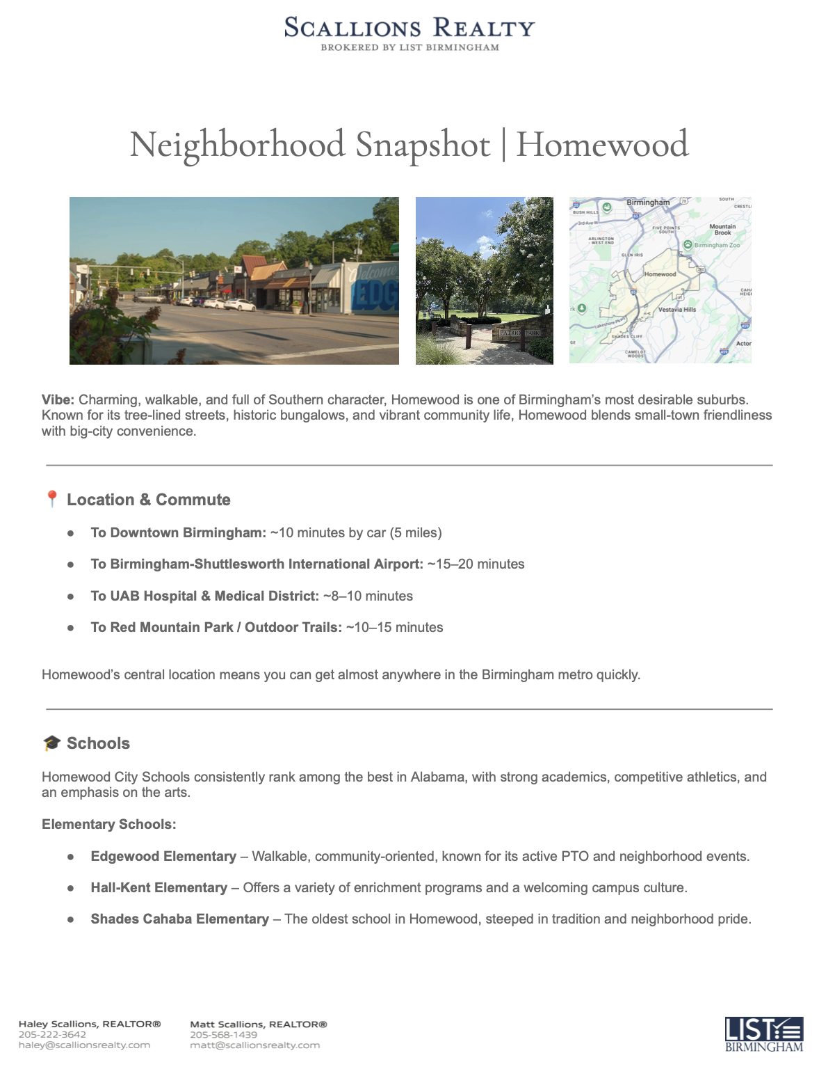 We’ve created a series of Neighborhood Snapshots to help you get to know the area before you make your move. Each guide highlights schools, restaurants, things to do, commute times, community feel, and current home pricing trends—so you can get a true sense of what life is like in Birmingham’s most popular neighborhoods.